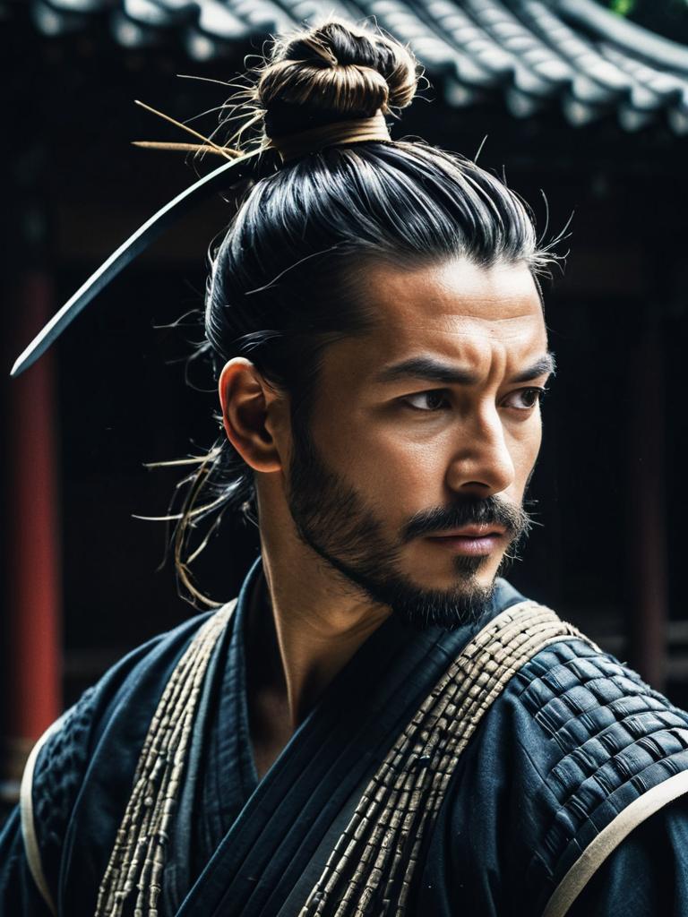 Man in Samurai Man Bun Hairstyle costume, cinematic realism, sharp portrait