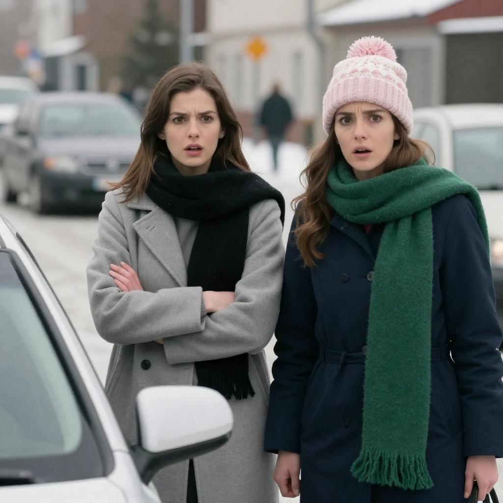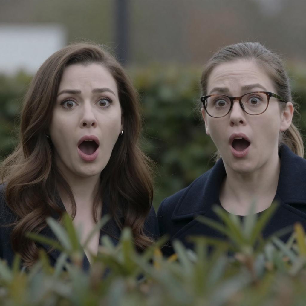 Photograph of two women with surprised expressions, mouths open wide in shock. The woman on the left has long, wavy brown hair, fair skin, and wears a dark coat. The woman on the right has light brown hair tied back, wears glasses, and a dark coat. They are partially obscured by green foliage, with a blurred outdoor background.