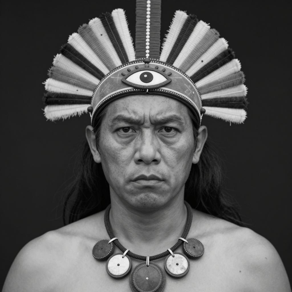 Black and white photograph of a man with a stern expression. He wears a headdress with striped, radiating patterns, a headpiece with an eye symbol, and a layered necklace with large, oval shapes. His skin is light, and he has a strong jawline. His hair is styled in the headdress. The background is dark. The man is facing forward.