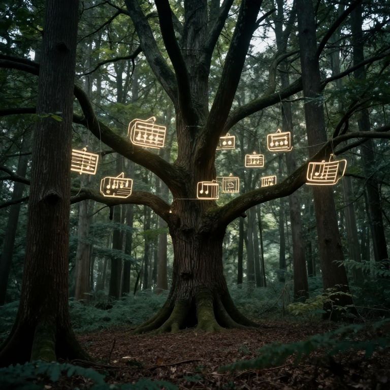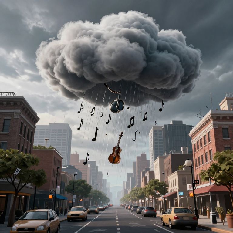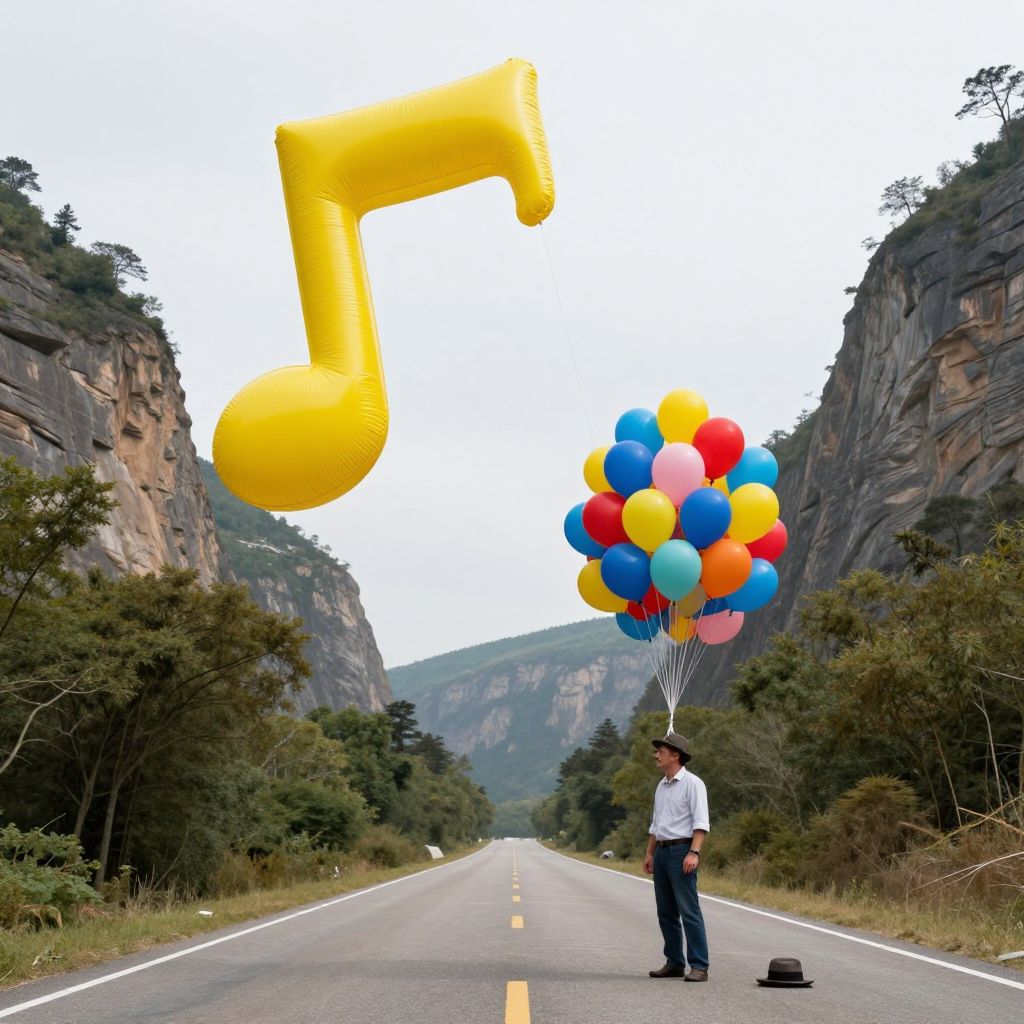 A surreal scene unfolds as a giant yellow musical note, inflated like a balloon, soars skyward, tethered by strings to a cluster of vibrant multicolored balloons held by a man in a fedora, who stands on a road flanked by trees and towering cliffs, while his hat lies abandoned on the ground nearby.