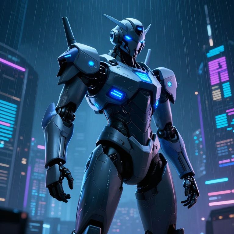 A CGI-rendered image of a futuristic, humanoid robot standing in a rain-soaked, neon-lit cityscape at night. The robot has a sleek, metallic silver body with blue glowing accents on its shoulders, chest, and head. Its head features angular, horn-like protrusions, and its eyes emit a bright blue light. The background is filled with tall skyscrapers adorned with colorful neon signs in shades of pink, blue, and purple. Raindrops are visibly falling, adding a sense of motion and atmosphere. The robot's pose is powerful, with its arms slightly bent and hands open, exuding a sense of readiness and strength.