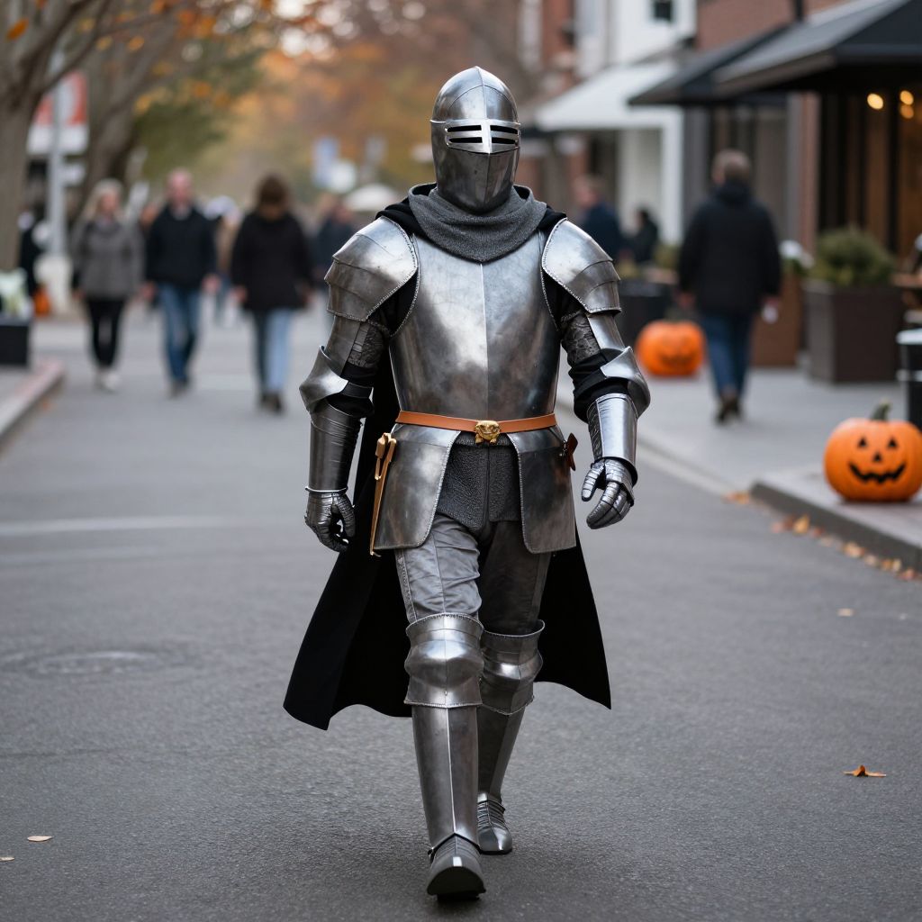"Tin Man Halloween, dressed in a knight costume walking down a street"