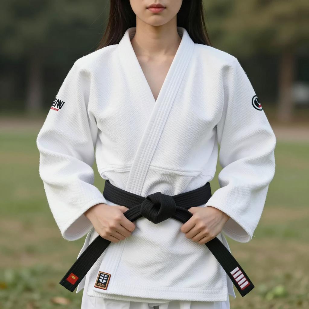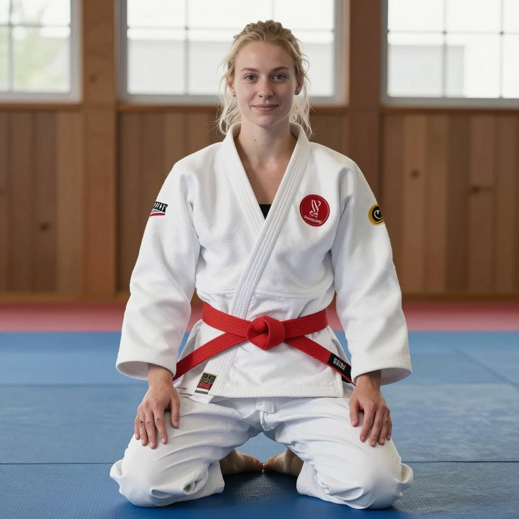 Blonde woman with a slight smile kneeling on a blue mat wearing a white judo gi and a red belt. She has a red patch on her left shoulder and cuts on both knuckles. The background features a wood-paneled room with large windows, illuminated by bright natural lighting.