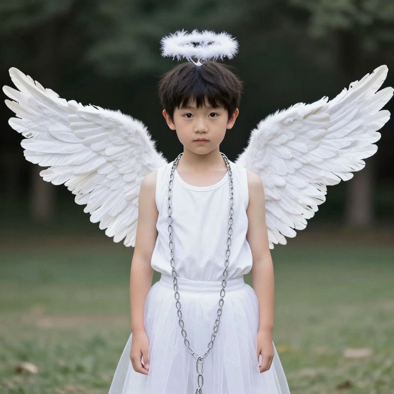 Angel Fancy Dress, boy dressed as an angel with wings and a chain