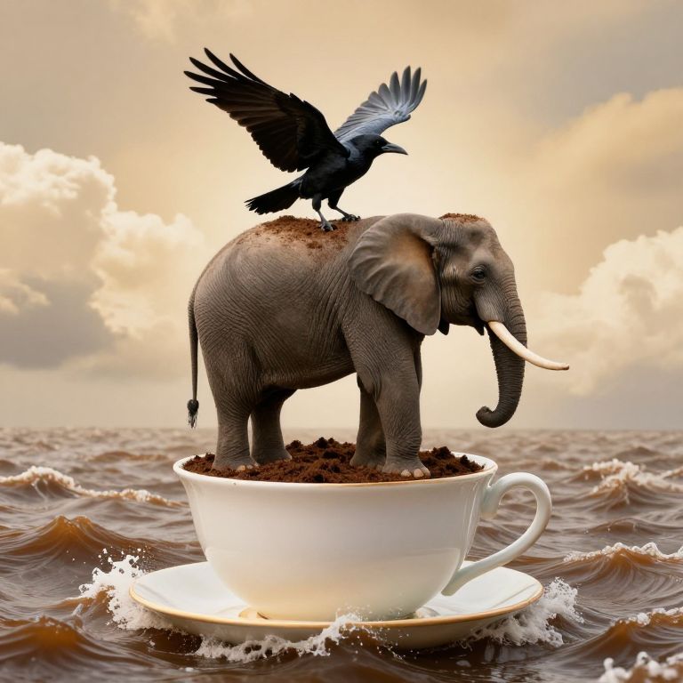 Elephant stands gracefully atop a teacup-shaped vessel filled with rich brown soil, floating serenely above turbulent coffee-colored ocean waves, while a crow with outstretched wings perches confidently on its back, guiding the surreal journey against a backdrop of soft, golden clouds.