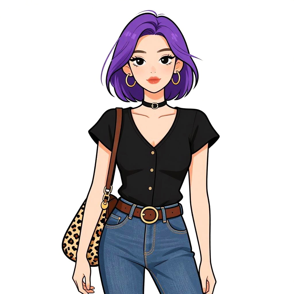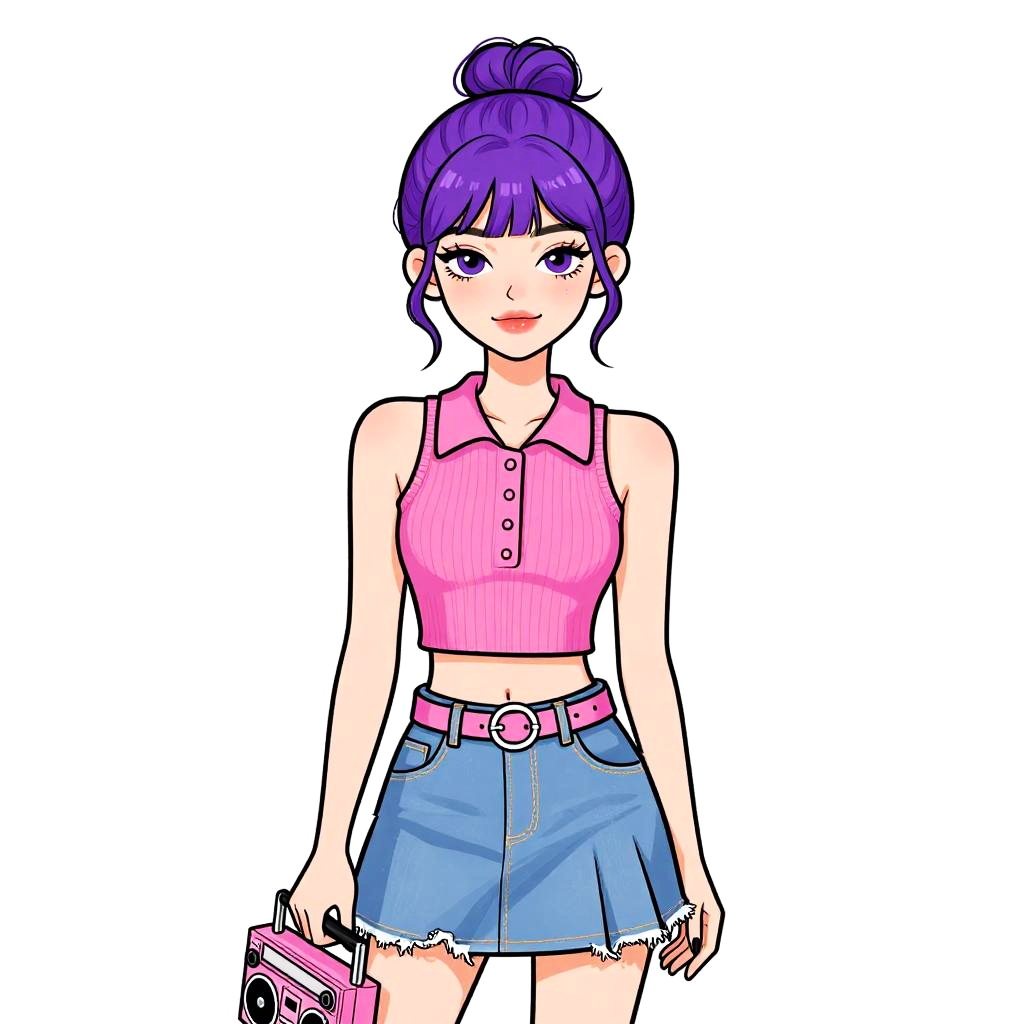 Woman with pretty face and pretty hair. Woman, quirky preppy, sleeveless pink crop top with collar and partial button-up, eyelash knit texture, light wash denim pleated miniskirt with raw hem, pink belt with circular buckle, high-waisted, holding a pink boombox accessory, messy bun hairstyle with wavy bangs, plain white background. --sref 1467