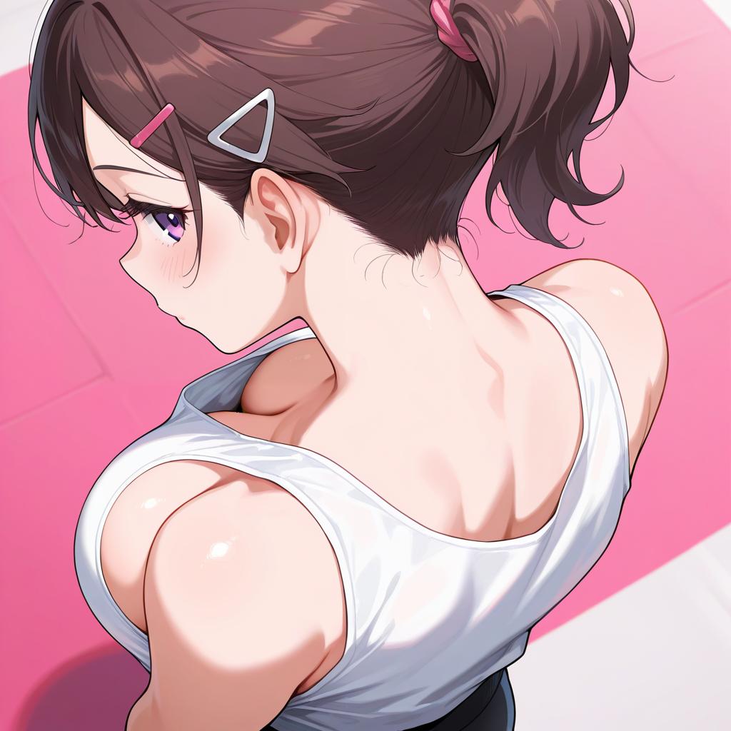 Digital illustration of an anime-style girl with a pixie cut and brown eyes, wearing a white tank top and black bottoms. The character is depicted from above and behind, showcasing her cleavage and nape. She has two blue hair clips and a soft, sideways glance looking back at the viewer. The background features soft pink and beige tones. The illustration combines elements of gym wear and casual style.