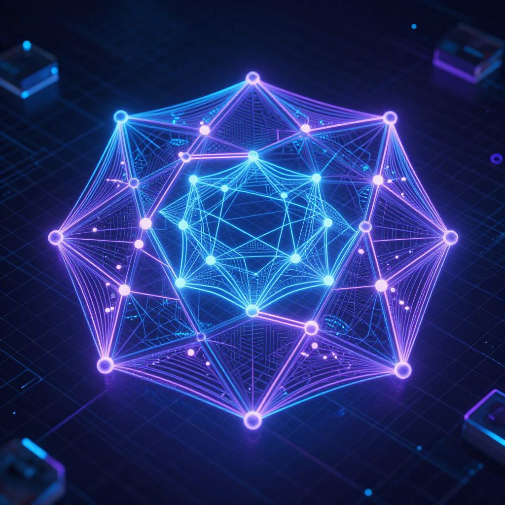 Digital CGI image of a glowing, neon blue 3D geometric network of interconnected nodes and lines against a dark, grid-patterned background.