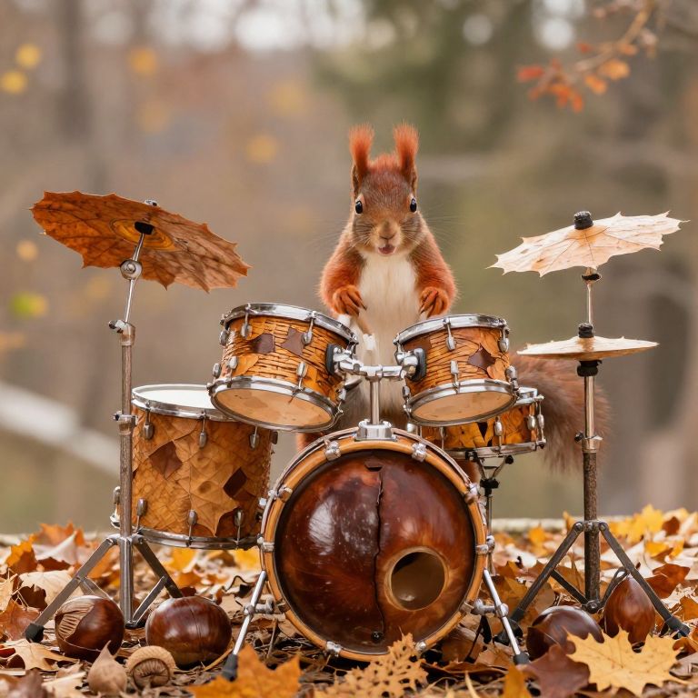 A professional photograph of a quirky squirrel with a fiery red mohawk, energetically playing a whimsical drum set in a vibrant autumn forest, The drum kit is entirely imagined, with bass drums made from hollowed, oversized chestnuts that have been polished to a gleaming finish, The snare drum is crafted from a woven basket of intertwined twigs and leaves, producing a crisp, earthy sound, Cymbals are formed from large, dry maple leaves, their edges curled and textured, hanging on thin branch stands, Smaller acorns serve as tom-toms, and the hi-hat is composed of overlapping oak leaves, delicately stacked on a twig frame, Every element of the drum set is organic, blending seamlessly into the forest floor, which is blanketed in a rich layer of autumn leaves, as the squirrel’s paws expertly tap the instruments, filling the scene with the imagined rhythm of nature