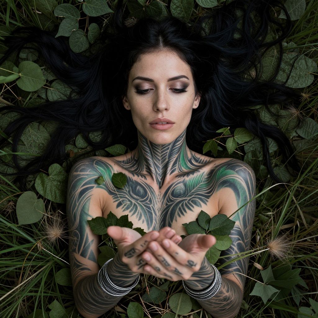 The image depicts a striking figure with dark, flowing hair, adorned with intricate black and green tattoos that cover her neck and chest. She is surrounded by lush greenery, with leaves and grasses intertwining around her, creating a sense of nature's embrace. Her hands, which are adorned with bracelets, are positioned in front of her, as if she is holding something delicate or performing a ritual. The overall composition is rich in texture, with the smoothness of her skin contrasting against the roughness of the leaves and the detailed patterns of her tattoos. The interplay of light and shadow adds depth to the scene, highlighting the contours of her face and the delicate veins on her hands. The image evokes a sense of connection with nature, as if the woman is a guardian or a part of the natural world, embodying a harmonious relationship between humanity and the environment.