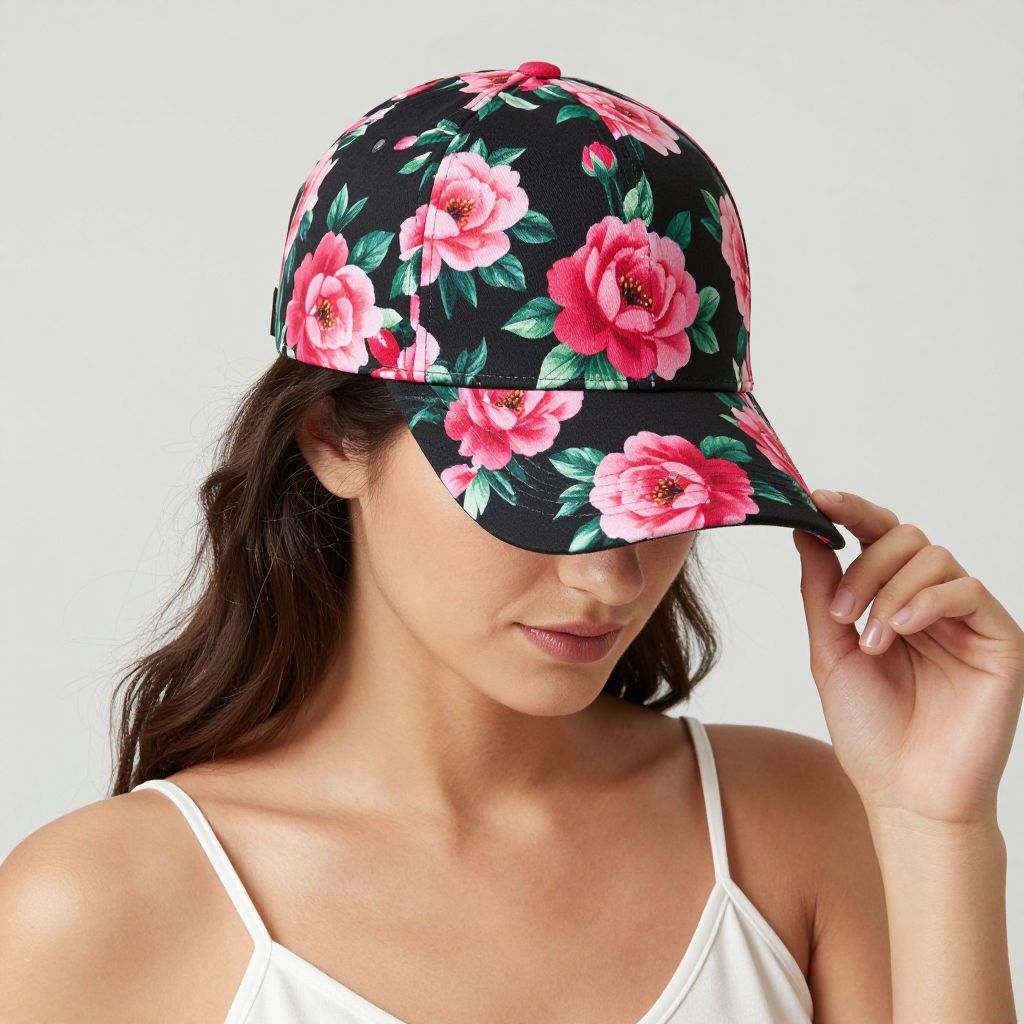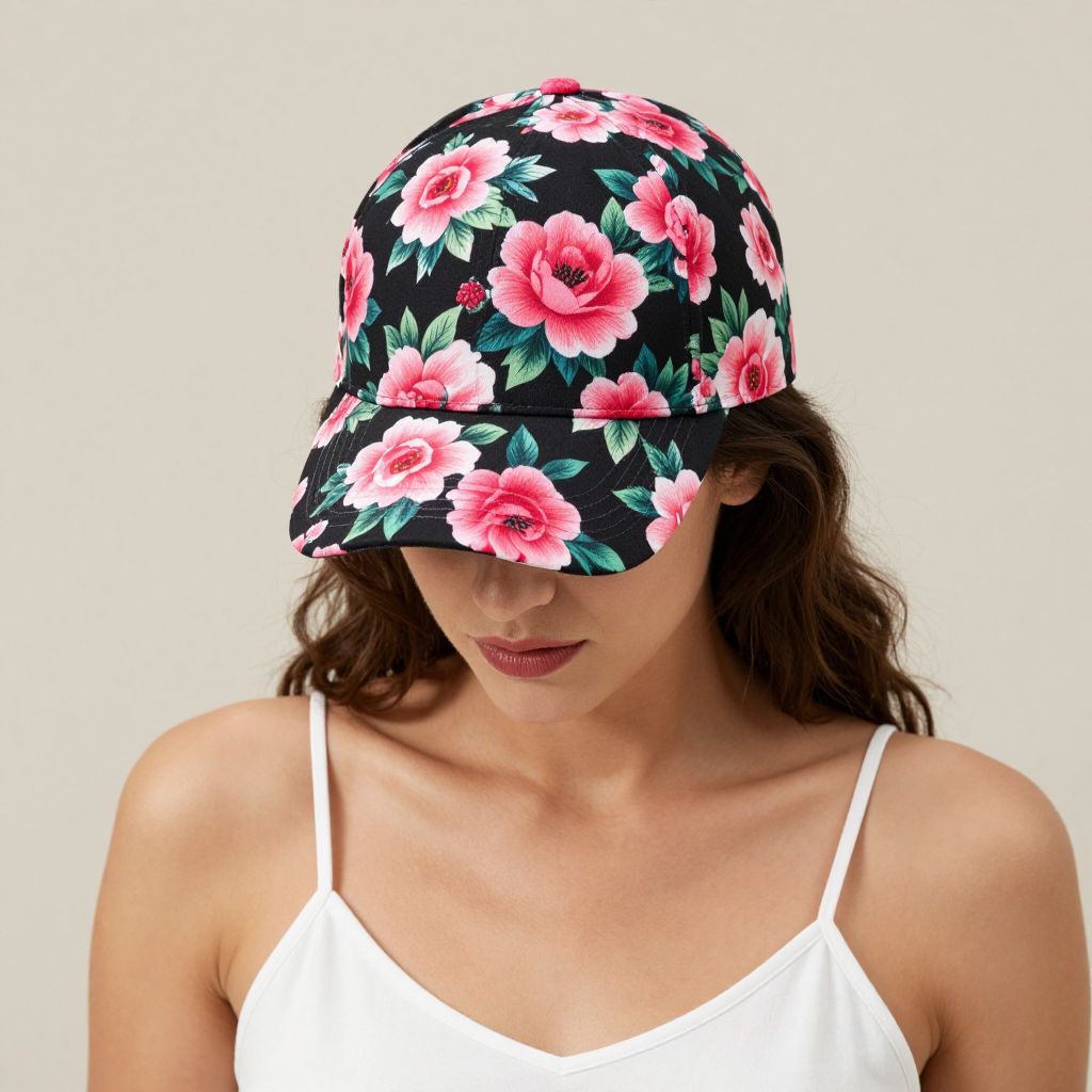 Fashionable woman wearing a vibrant floral baseball cap featuring bold pink roses and green leaves against a black background, paired with a white spaghetti strap top, showcasing a stylish summer accessory.