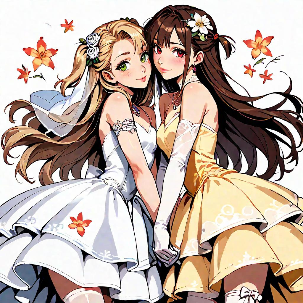 This digital anime-style drawing depicts two young women standing closely together, facing forward. The woman on the left has long blonde hair with a white rose hairpiece, green eyes, and wears a white, sleeveless, lace-trimmed dress with white gloves. The woman on the right has long dark brown hair with a white flower hairpiece, red eyes, and wears a yellow, sleeveless, lace-trimmed dress with white gloves. Both women have fair skin and are smiling gently. Orange butterflies are scattered around them, adding a whimsical touch. The background is plain white, emphasizing the characters and their dresses. The overall style is vibrant and detailed, with strong lines and bright colors.