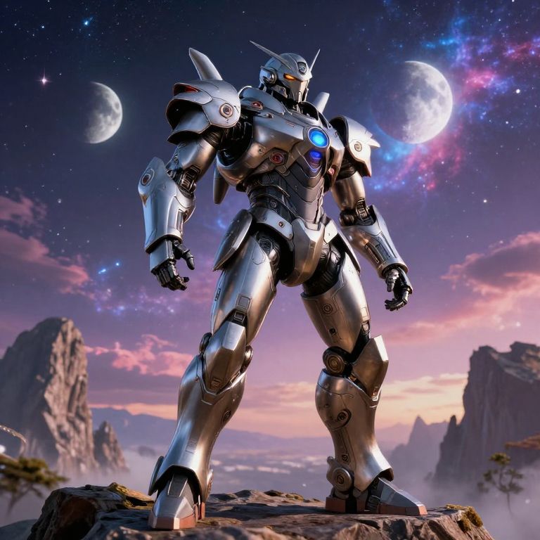 Photorealistic CGI of a metallic, armored robot with glowing blue and red energy cores, firing orange laser beams against a bright blue sky with a red