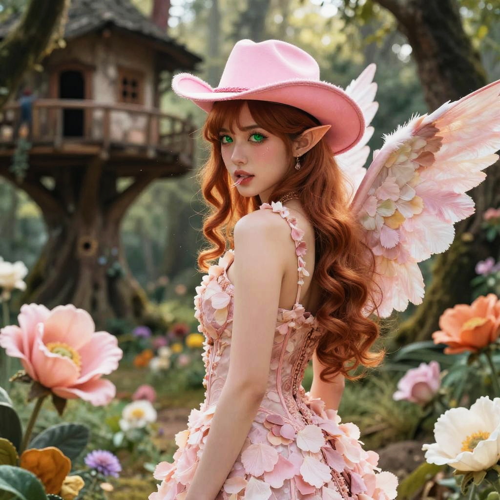 Portrait of a fantasy-inspired young woman with long auburn curled hair, emerald green eyes, and pointy elf-like ears. She wears a pink cowboy hat and a unique dress made from pink flower petals. Large, detailed pink fairy wings extend from her back. The background features lush jungle foliage and a rustic wooden treehouse, creating a magical, outdoor setting.