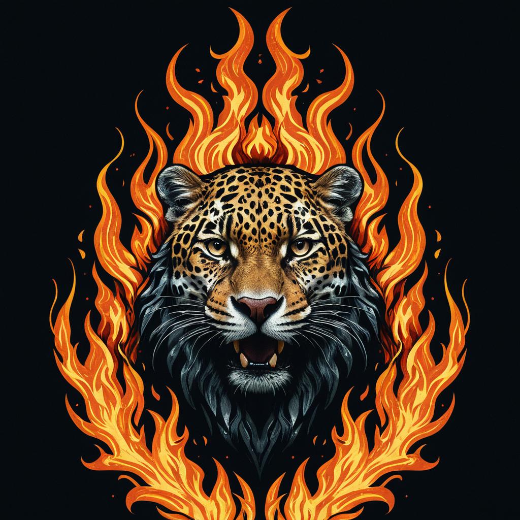 Detailed black and white sketch of a jungle jaguar with bold tribal line work, set against a deep green background. The illustration emphasizes the jaguar's stealth, power, and survival instincts with intricate patterns and striking green eyes. Tropical palm leaves partially frame the design, enhancing the rainforest theme.