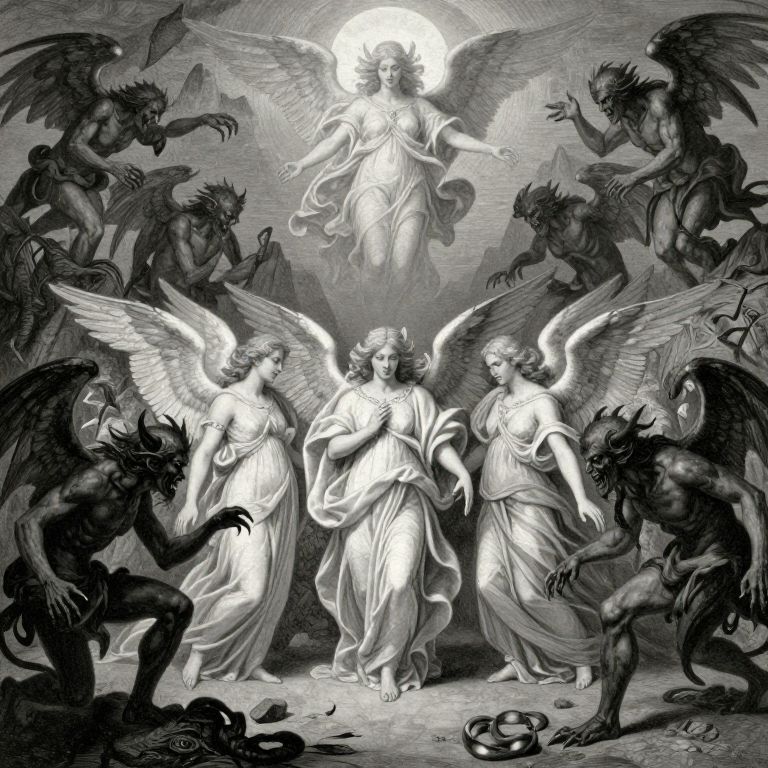 Black-and-white engraving of angelic women with wings, surrounded by demon-like creatures, with a radiant haloed figure above them.