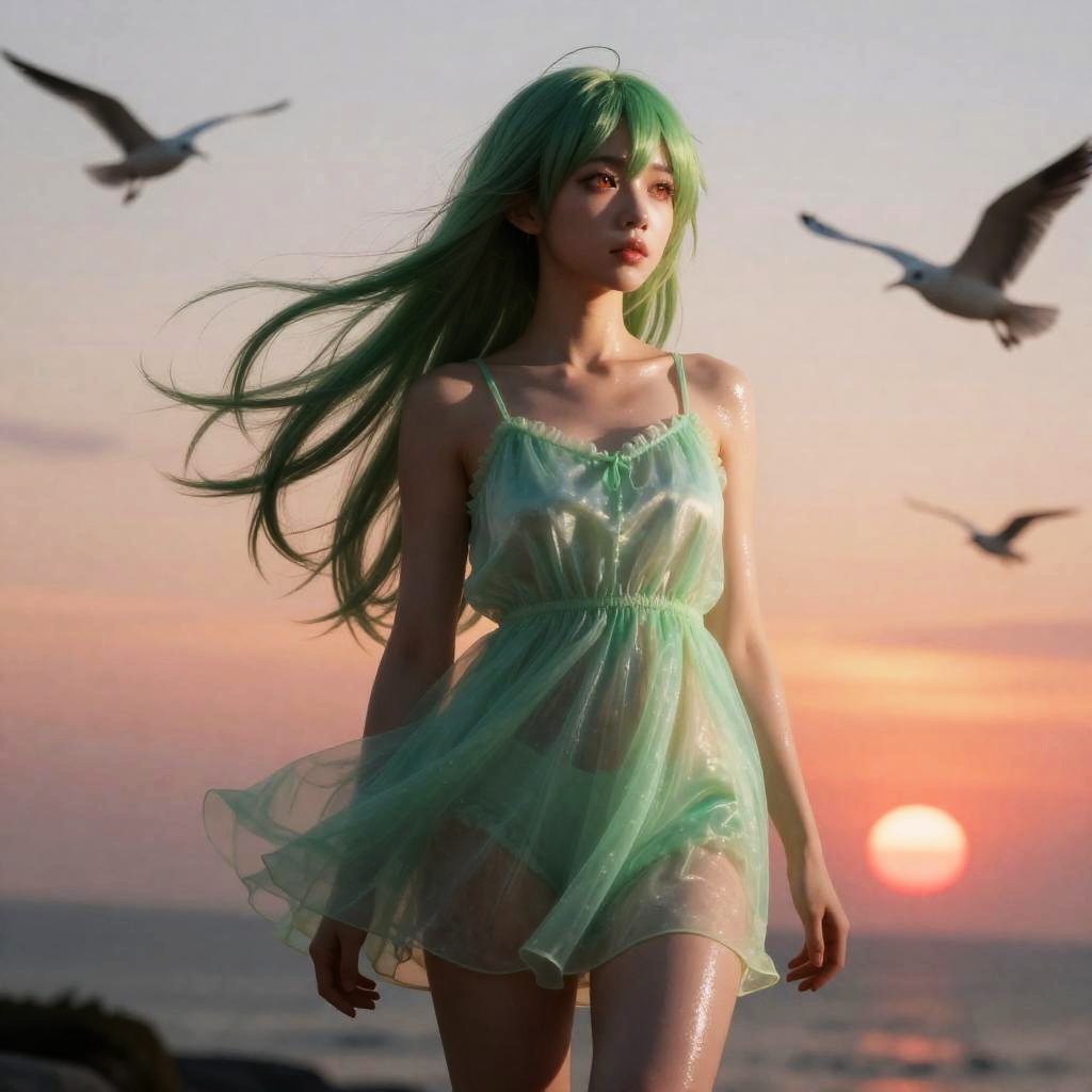 Realistic Green-Haired Girl in White Bikini