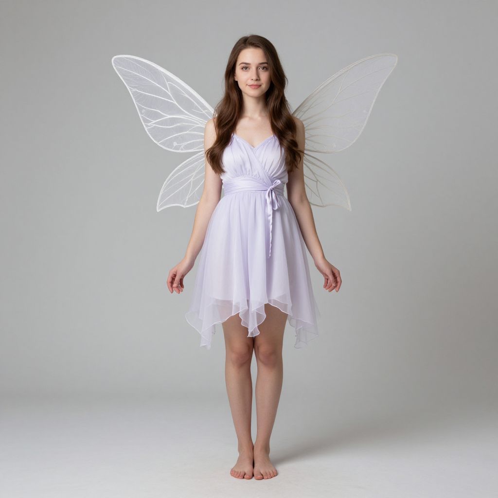 Light purple fairy costume, 1girl, wings, solo, dress, barefoot, fairy, brown hair, long hair, fairy wings, white dress, full body, standing, realistic