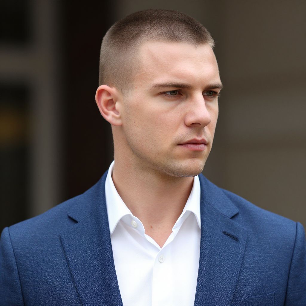 A fit European man with short natural hair, dressed in a tailored smart casual outfit, realistic image, emphasizing his clean-shaven face and the contrast between his hair and skin tone in natural lighting