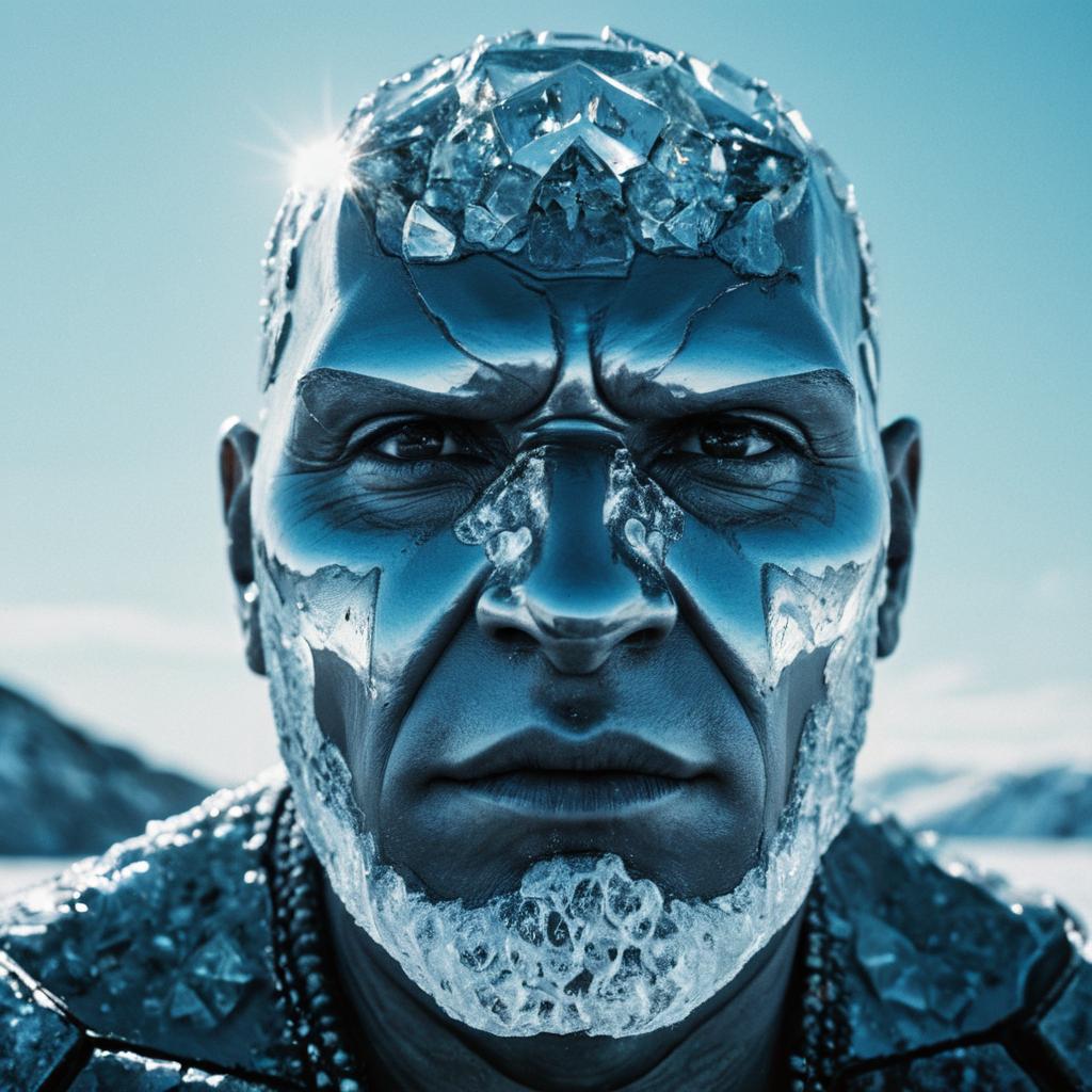 Hyperrealistic close-up portrait of a male crystal golem face with intricate icy crystal formations on the skin. The figure's expression is intense and focused, with reflections emphasizing the cold, icy texture of the crystals. The background features a cold, icy landscape with mountains under a clear blue sky.