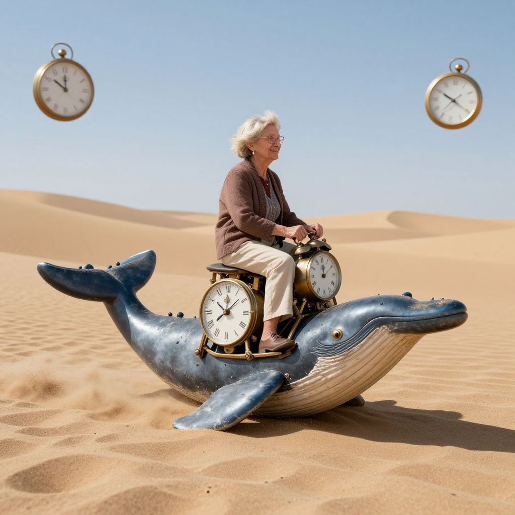 An elderly woman rides a clockwork whale through a desert of forgotten timepieces, where every grain of sand is a paused second.