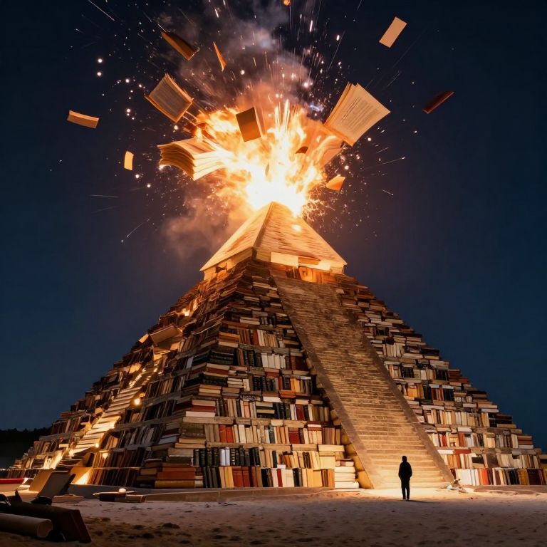 Photograph of a large, pyramid-shaped structure made of stacked, illuminated books at night, with a single figure standing at the base. The pyramid explodes in a bright, fiery burst of flames and flying books, creating a dramatic sky. The sky is dark blue, and the explosion emits orange and yellow light. The base of the pyramid is lit with warm lights, highlighting the books' colors. The figure is small compared to the towering structure, adding a sense of scale. The ground is sandy, and the overall scene is dynamic and visually striking.