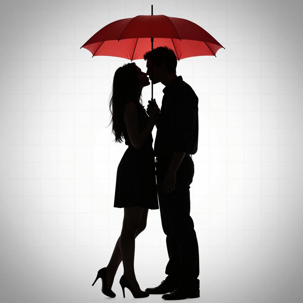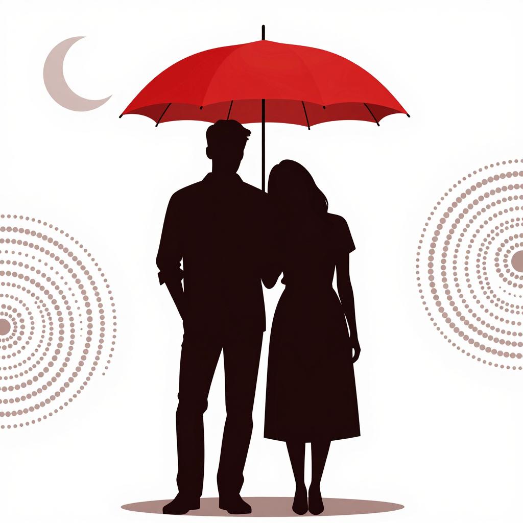 Digital illustration of a romantic couple standing close together under a red and black umbrella. The man is dressed in a black suit with a white shirt, holding the umbrella, while the woman wears a white blouse, black skirt, and black high heels. The couple shares a tender moment as the woman kisses the man's cheek. The background is an old grey grid-patterned paper, with clear shadows and black outlines emphasizing the figures.