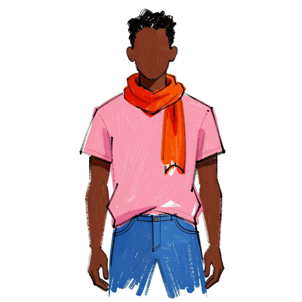 This is a digital drawing of a person with dark skin, sketchily depicted with bold, rough strokes. They're wearing a pink shirt and a red-orange scarf, with blue pants. The background is stark white, creating a strong contrast with the vibrant colors and the dark silhouette of the person. The style is abstract and expressive, with a focus on color and form.