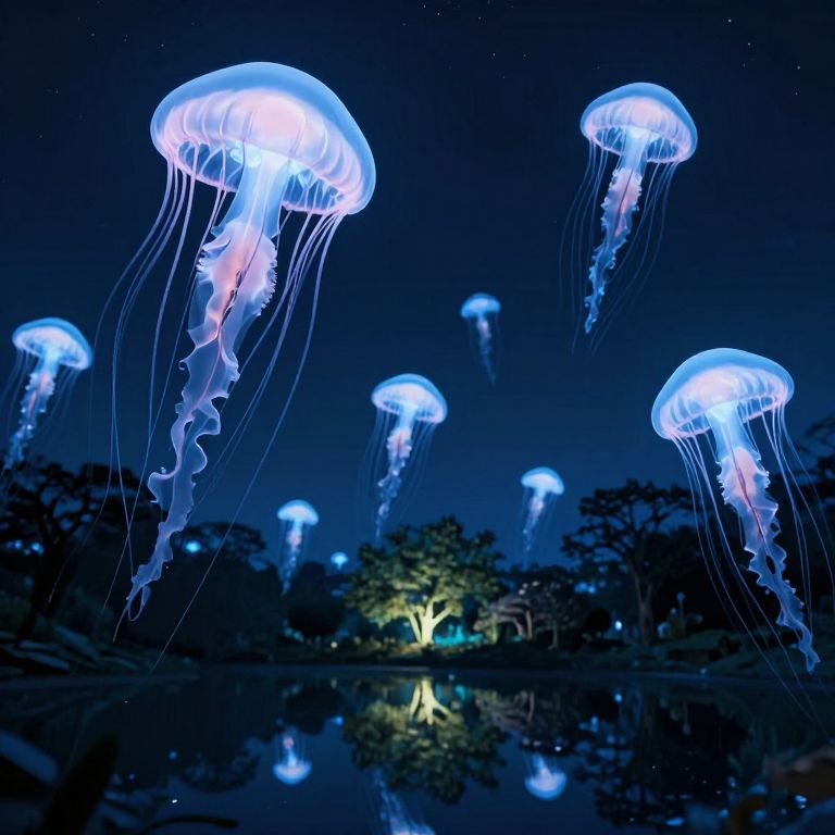 Gigantic bioluminescent jellyfish float serenely across a nocturnal sky, their ethereal glow illuminating a tranquil landscape below, where trees and water mirror their otherworldly radiance.