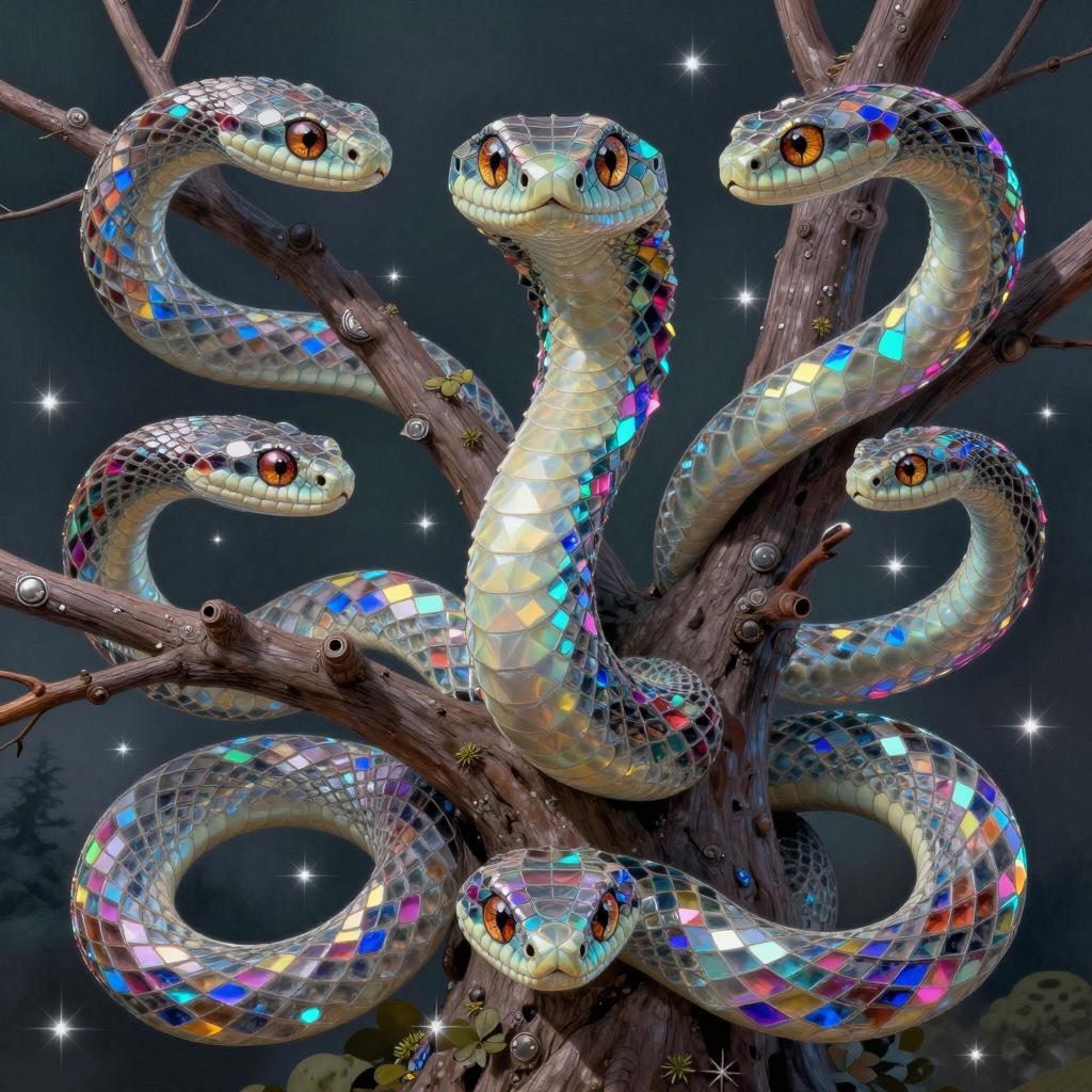 Rule Of Thirds Many Snakes with clockwork eyes winding around branches of a tree Eye of Clockwork snakes, by Benoit B. Mandelbrot, Caspar David Friedrich, Junji Ito, Thomas Kinkade and Clint Clearley, H.R. Giger, Gustave Doré, Cosmic crystal snake fantasy, surreal, Holographic, Iridescent, Colorful, symmetrical, soft lighting, Sparkles,