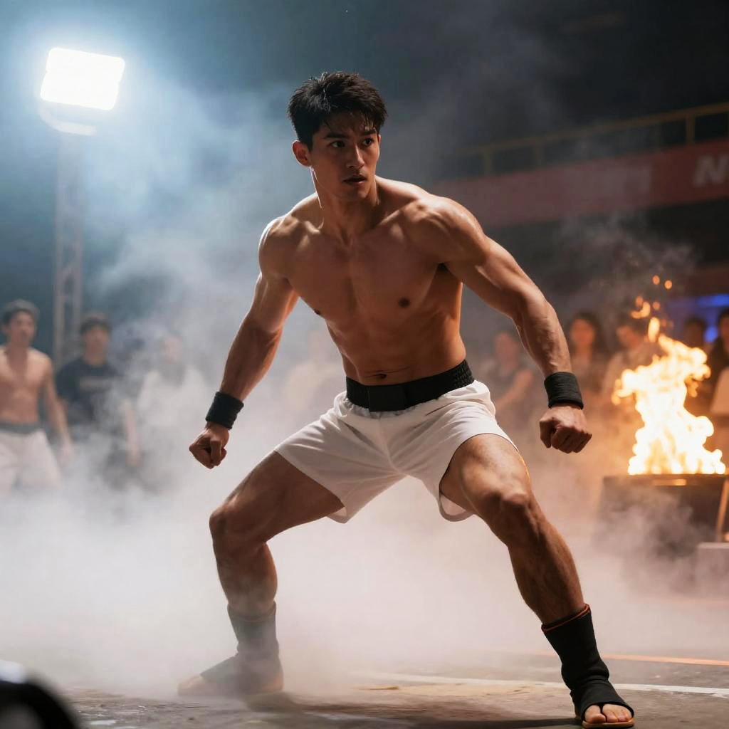 Muscular shirtless man with dark hair, white shorts, and wristbands, crouches in a misty arena, intense expression. Bright spotlight from left, flames on right, crowded background. Dynamic action pose, mist obscuring lower body.