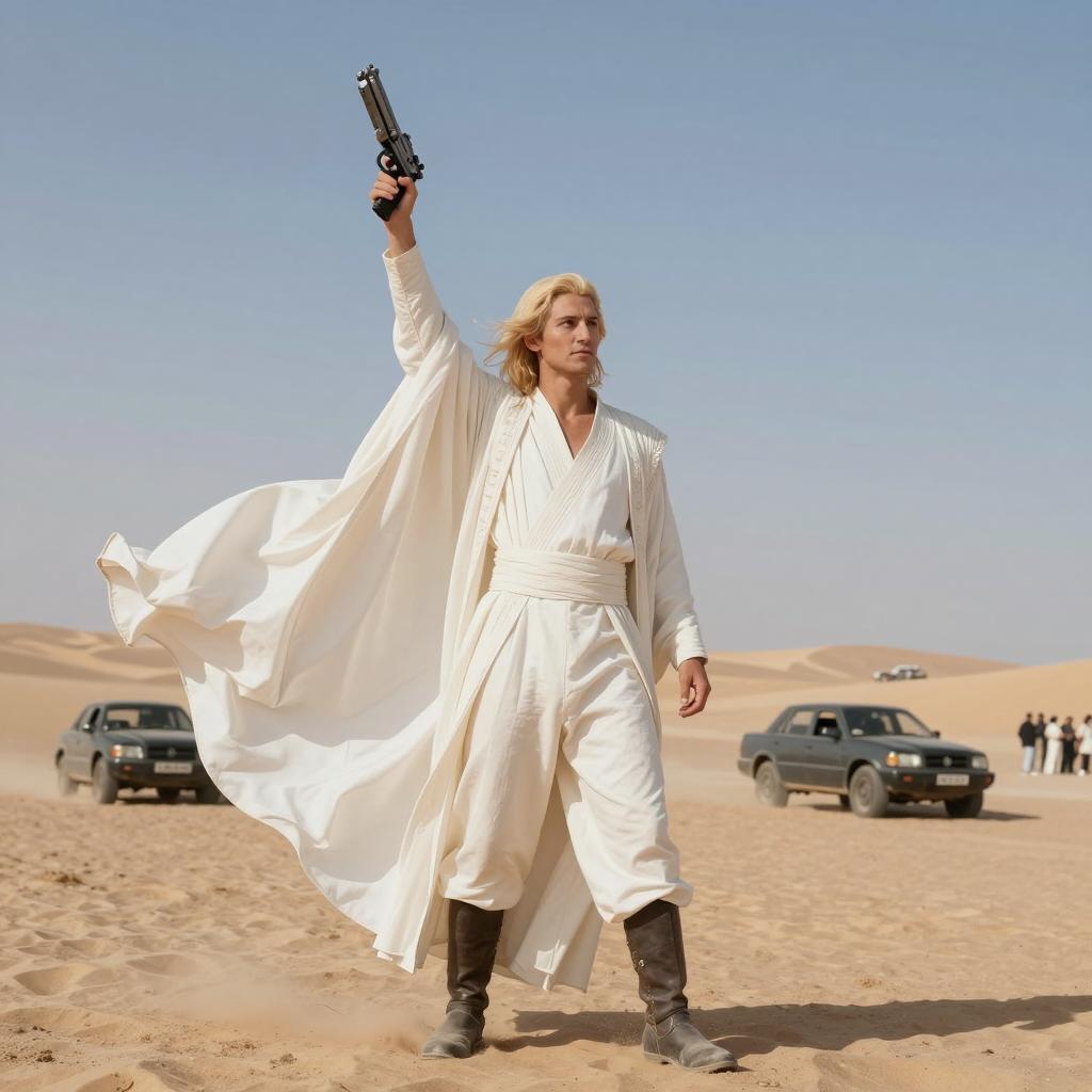 Man with blond hair in white, flowing robe raises right arm with a blaster in a desert landscape. Background includes scattered dark vehicles and a distant group of people. Bright, clear sky. Light fabric billows around him.