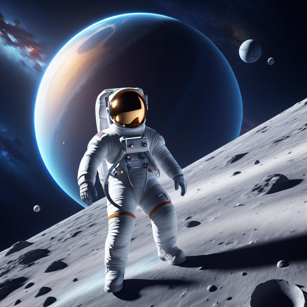 High resolution 3D rendering of an astronaut in a white space suit with a gold visor standing on a rocky, barren lunar-like surface. The scene includes a large blue planet and smaller moons visible in the dark starry sky, emphasizing a cinematic and simple composition.