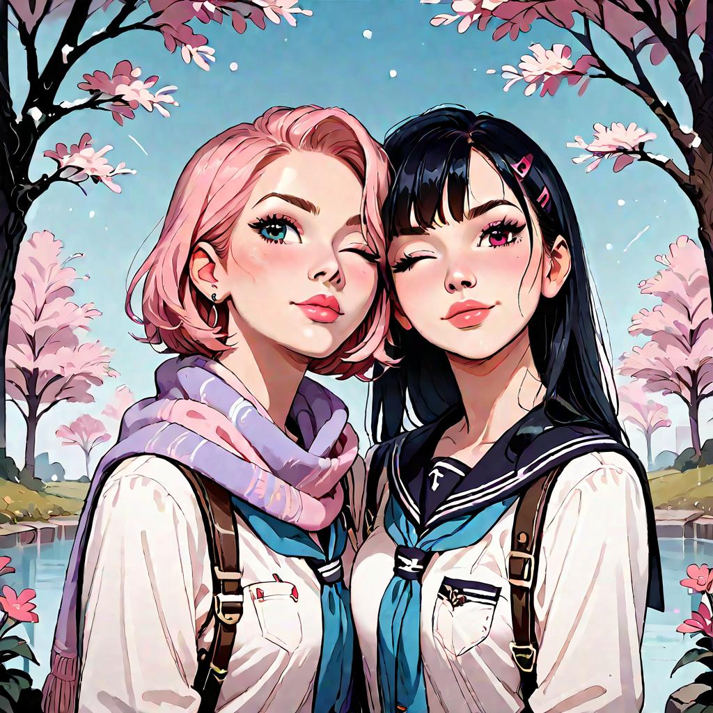 Digital artwork of two anime-style schoolgirls standing close together by a riverbank with cherry blossom trees in the background. Both girls are winking and share a light purple scarf. The blonde girl with pink-tinted hair wears a white school uniform with blue necktie and backpack straps, while the dark-haired girl wears a similar uniform with a sailor collar and pink hairpins. Light snowflakes fall gently around them creating a serene and charming atmosphere.