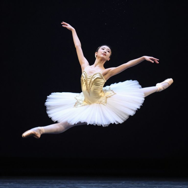 Photograph of a female ballet dancer mid-leap against a black background. She wears a gold-embellished, strapless bodice with a white, fluffy tutu. Her right arm is extended upwards, while her left arm is curved behind her. Her right leg is extended forward, and her left leg is bent backward at a right angle. Her dark hair is neatly pulled back, and she wears white tights and pink pointe shoes. The lighting highlights her figure, creating a dramatic contrast with the dark background. Her expression is focused and serene.