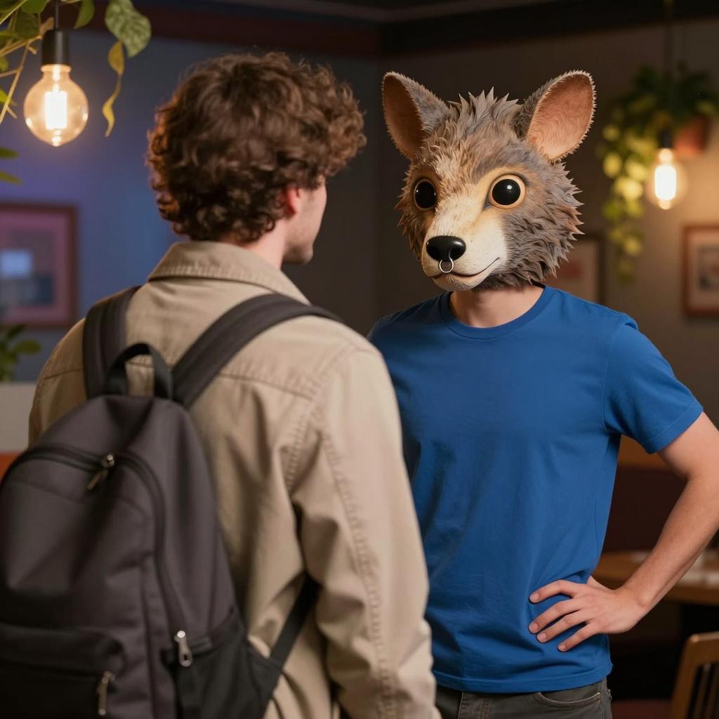 Man with brown hair, beige jacket, and backpack facing a person wearing a blue shirt and large, exaggerated animal mask with wide eyes and a nose ring. Dimly lit, colorful background with hanging lights and plants. Two people. Masked person stands with hands on hips, man faces mask.