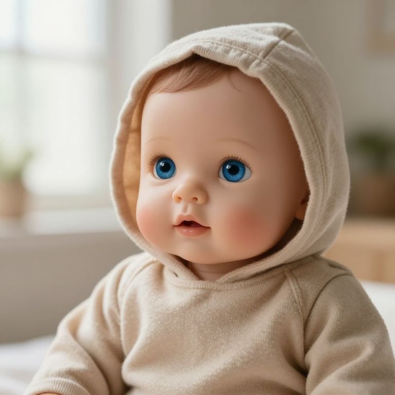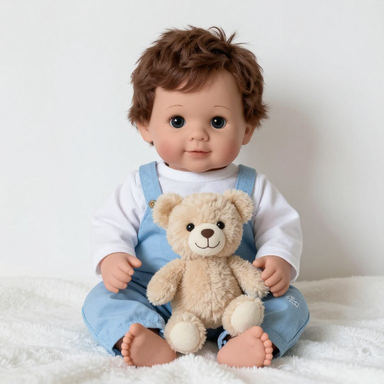 Cuddly reborn 22-inch toddler boy doll named \"Timmy\" sits comfortably on a soft white blanket, cradling a plush beige teddy bear with a cheerful smile, while wearing light blue overalls and a white long-sleeve shirt.