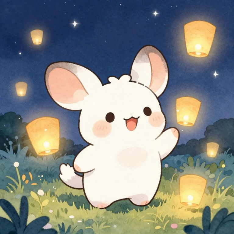 Cute:cyegtugci-k= fantasy animal character with oversized ears and a playful smile, surrounded by floating lanterns in a dreamy nighttime meadow under a starry sky, rendered in soft watercolor style with gentle light effects