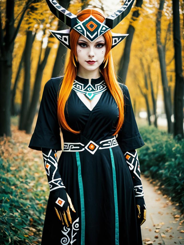 Woman cosplay. Wearing Midna costume. Realistic photo. Dressed as Midna --sref 1392