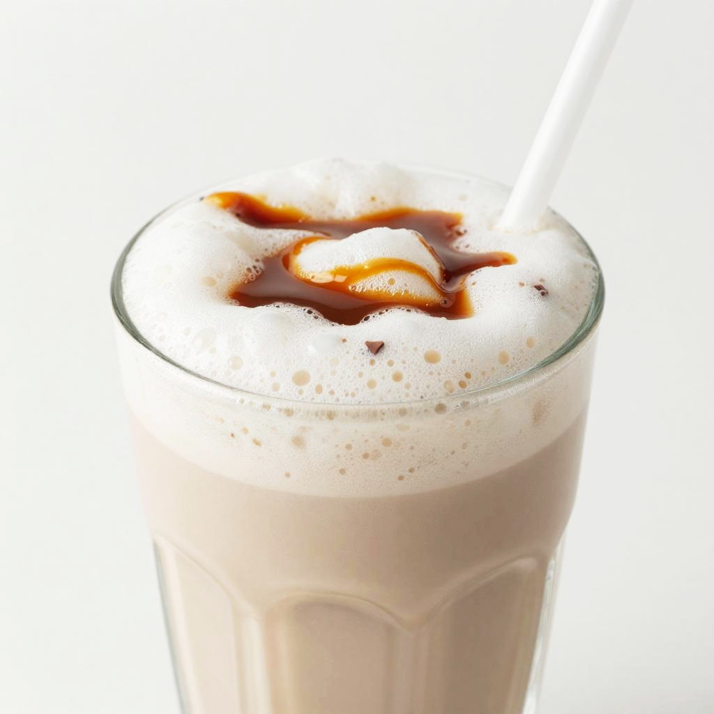 Photograph of a glass filled with a frothy, light brown milkshake topped with a layer of whipped cream and caramel drizzle. The glass has a subtle embossed pattern and the milkshake is thick with visible bubbles on the surface. The caramel drizzle forms small pools on the whipped cream, creating a visually appealing contrast. The background is completely white, making the milkshake the focal point of the image. The glass is positioned slightly off-center to the right.