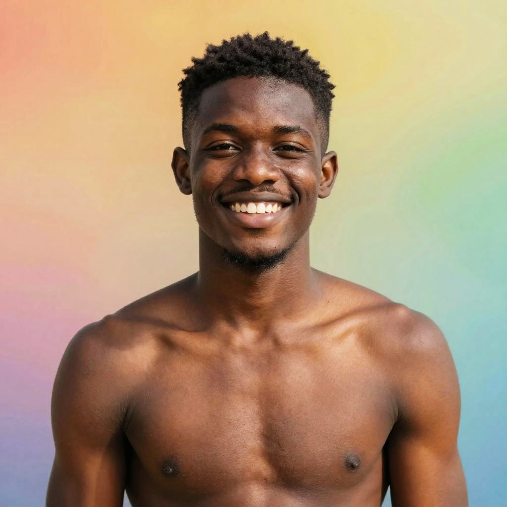 Photograph of a smiling, shirtless, dark-skinned Black man with short curly hair against a colorful rainbow gradient background. He has a lean,