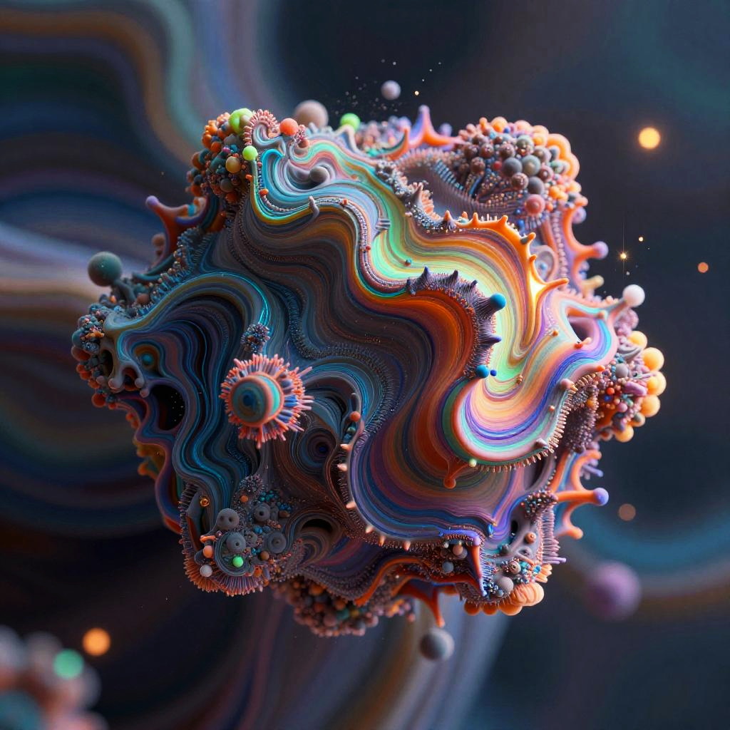 Orgasum visualized through fluid, swirling forms and radiant hues, combining organic textures with digital glitch effects, set in an abstract space filled with glowing particles and ethereal ambiance.