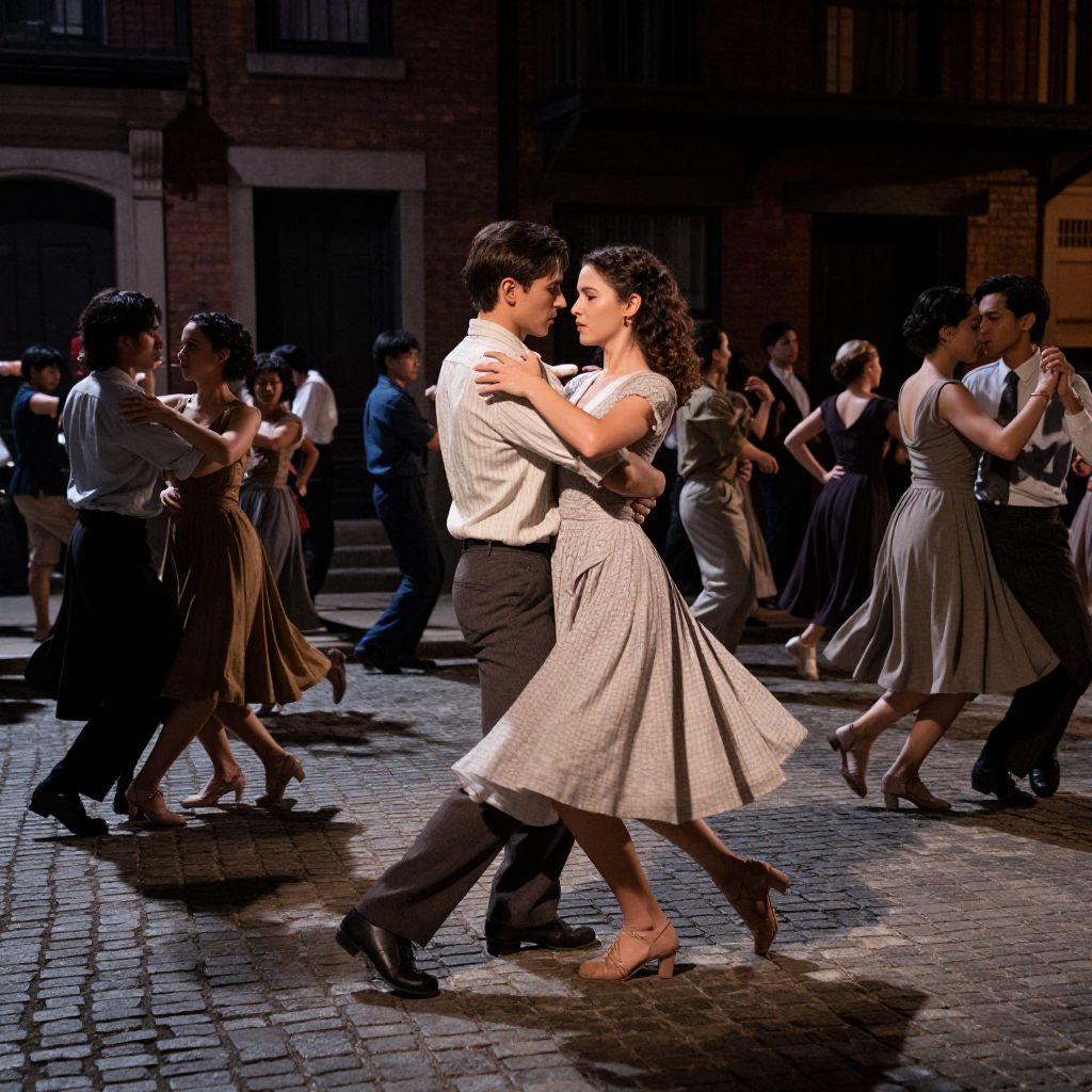 The image depicts an exterior dance scene from \"West Side Story,\" characterized by a dramatic and cinematic composition. The scene is bathed in high-contrast lighting, with volumetric shadows casting deep, intricate details on the characters and the surrounding environment. The characters are dressed in period-appropriate attire, with a woman in the foreground wearing a light-colored dress that stands out against the darker, more muted tones of the background. The background is filled with a crowd of people, some in motion, creating a sense of depth and activity. The architectural elements, such as the brick building and the cobblestone street, add to the realism and hyper-detailed atmosphere of the scene. The overall color grading is beautifully balanced, enhancing the cinematic feel and the dramatic impact of the moment. The scene is rendered with high octane realism, using advanced techniques like ray tracing and hyper-detailed photo-realism, making it appear as if it were captured in a high-resolution, 32k HDR image.
