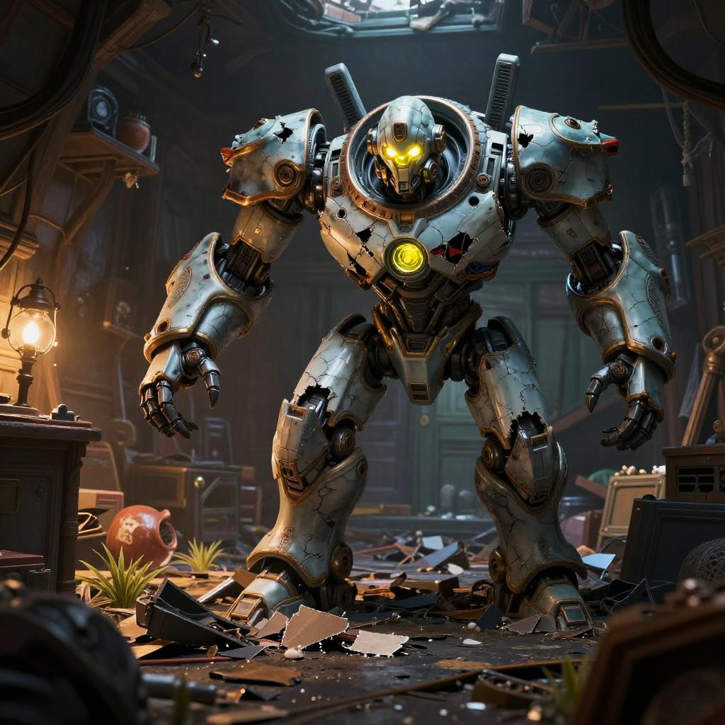 Wide angle Environmental shot in a cluttered and messy shack, action shot, tattered torn shirt, porcelain cracked skin, league of legends, vibrant, photo realistic, realistic, dramatic, dark, sharp focus, 8k."Robot destroyed to pieces with glowing yelow visor as a realistic scifi cyberpunk knight, medium shot, intricate, unreal engine, cozy indoor lighting, artstation, detailed, "james gurney, katsuhiro otomo, james paick, cinematic lighting, vibrant nature, Craig Mullins, Greg Rutkowski, Pete Morbacher, Tuomas Korpi, tekkon kinreet, volumetric light, trending on artstation, octane rendering.", studio photo, intricate details, highly detailed, by greg rutkowski