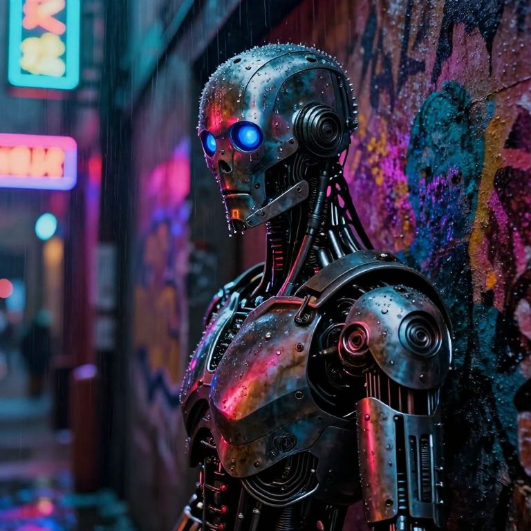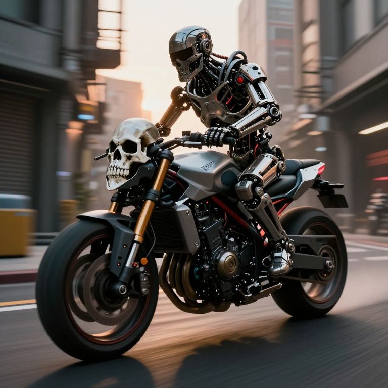 The image is featuring a terminator endoskeleton riding a Cyberdyne superbike with a skull mounted on the handlebars, metallic details, including bolts, wires, and mechanical components, giving it a highly advanced, industrial military look, red lights and diodes, He is riding at extreme speed down a narrow cyberpunk alleyway, extreme motion blur on the background and wheels emphasising the extreme speed, sunset