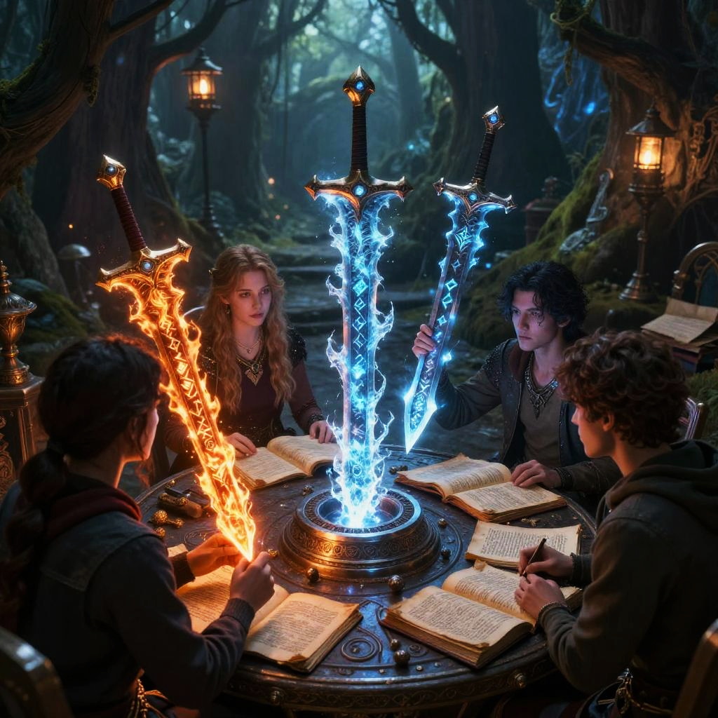 Four wizards around a glowing, enchanted table with a blue and orange fire-enchanted sword, studying ancient books in a mystical forest.