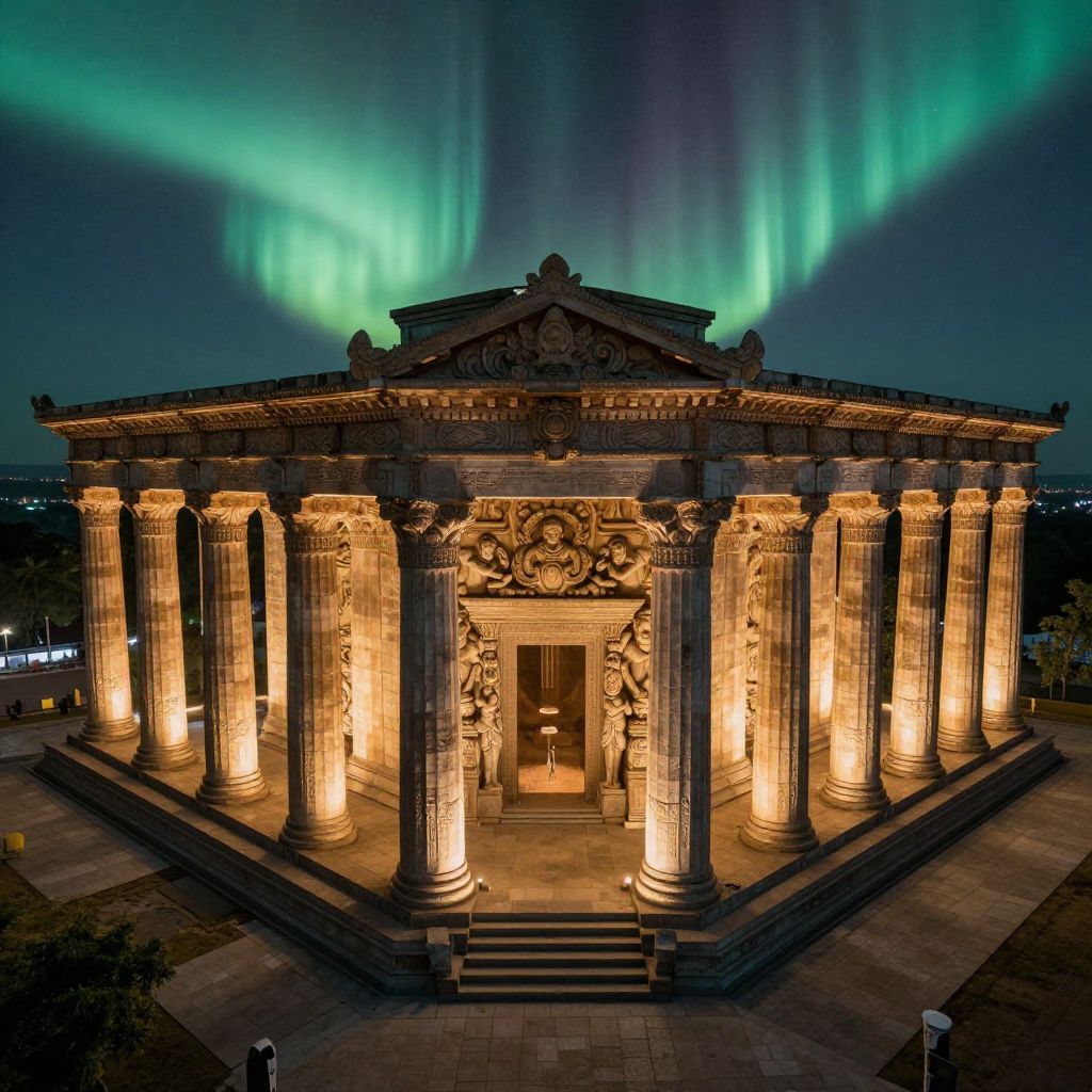Photograph of a neoclassical building at night, illuminated by warm, golden lights. The structure features six tall, ornate columns with intricate carvings above the central doorway. The background is dark, with vibrant green auroras glowing in the sky. The building's façade is detailed with bas-relief sculptures and a triangular pediment. Steps lead up to the entrance, and the surrounding area is paved with stone. The contrast between the illuminated building and the dark, illuminated sky creates a dramatic, almost surreal atmosphere.
