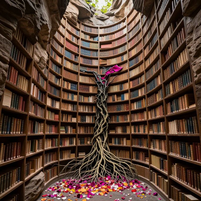 Beneath a canyon of whispering stone walls grows an enormous library where books choose readers, sprouting roots and petals when praised.