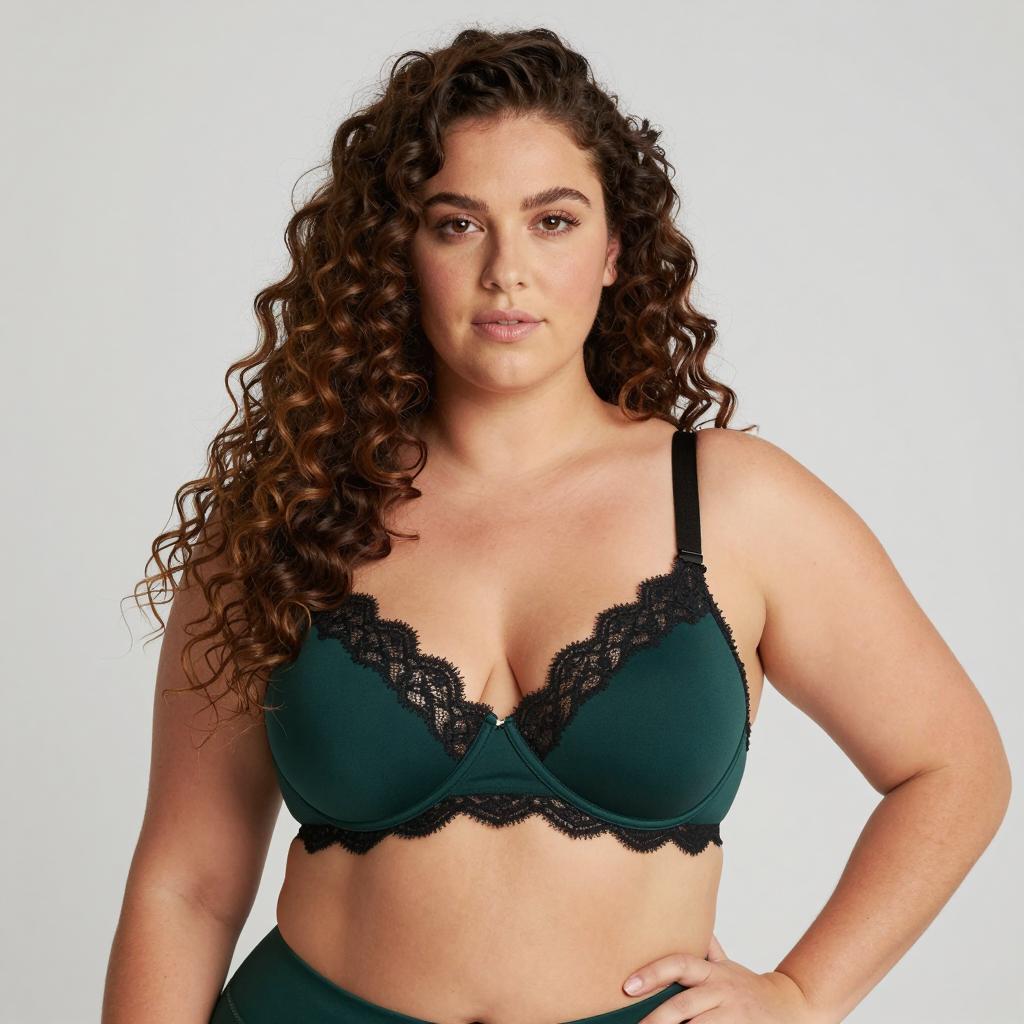 Photograph of a curvy woman with long, curly brown hair, wearing a dark green bra with black lace trim. She has light brown skin, a neutral expression, and is centered against a light gray background. Her right hand rests on her hip.