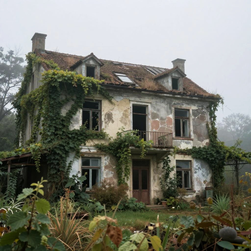 Abandoned vine covered house in overgrown garden, wild vines creep over cracked windows and crumbling stone, soft fog around, mysterious and nostalgic mood